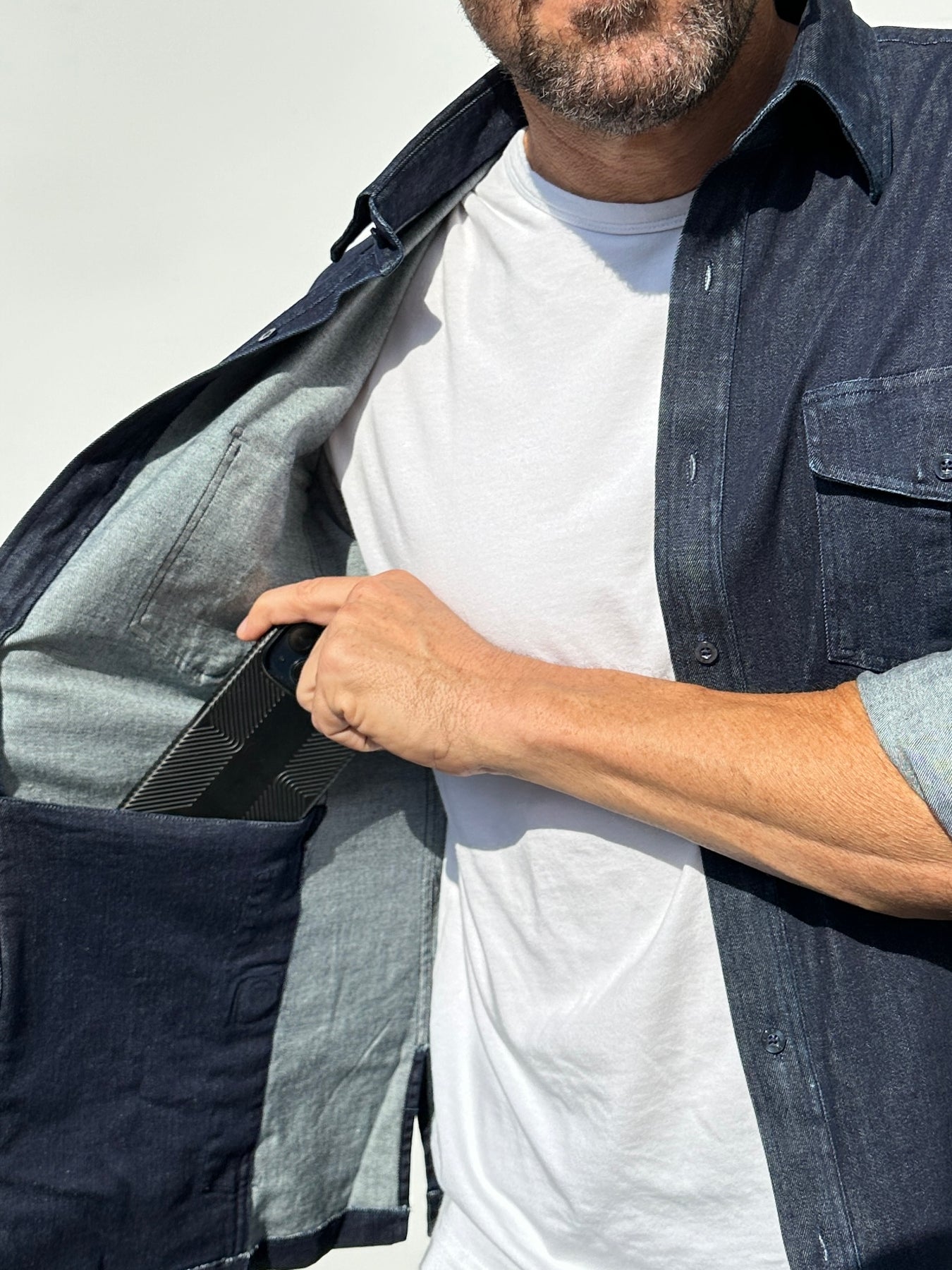 It features magnetic side-pockets that maintain a slim silhouette, magnetic chest pockets for easy access, hidden inside pockets that can't be picked, and the Shade-Lock™ to keep your glasses safe while not on your face.