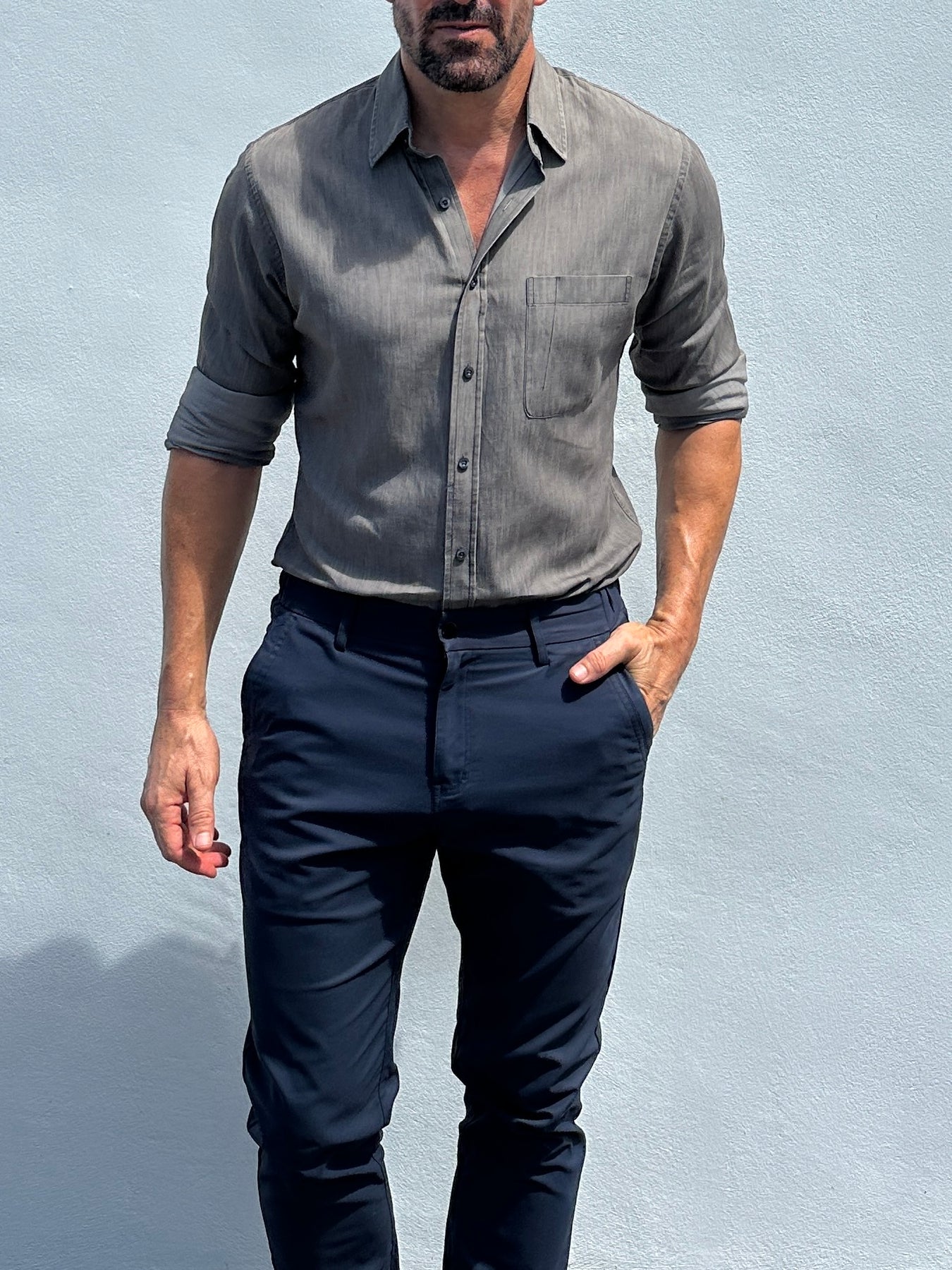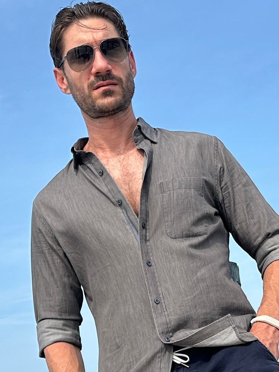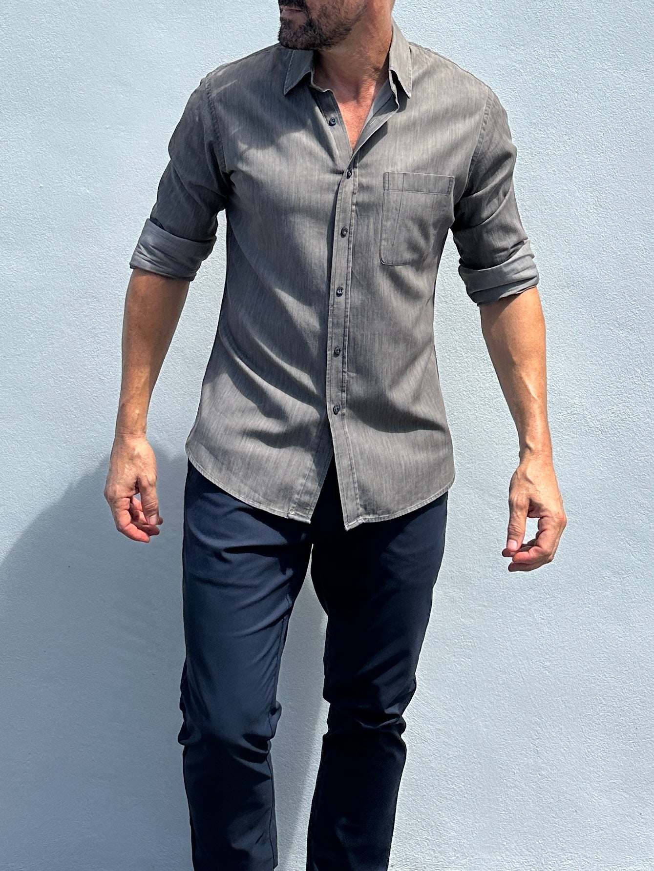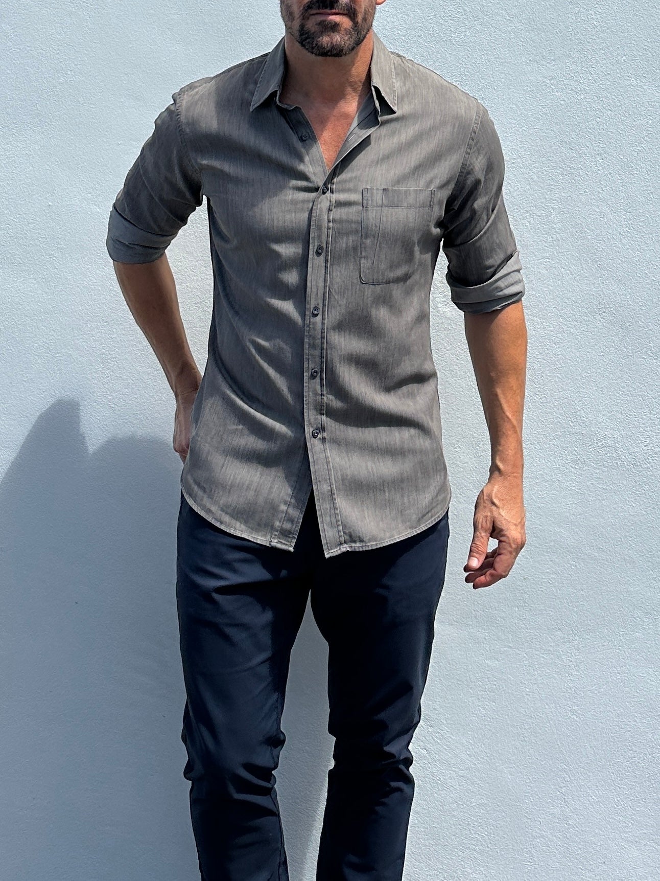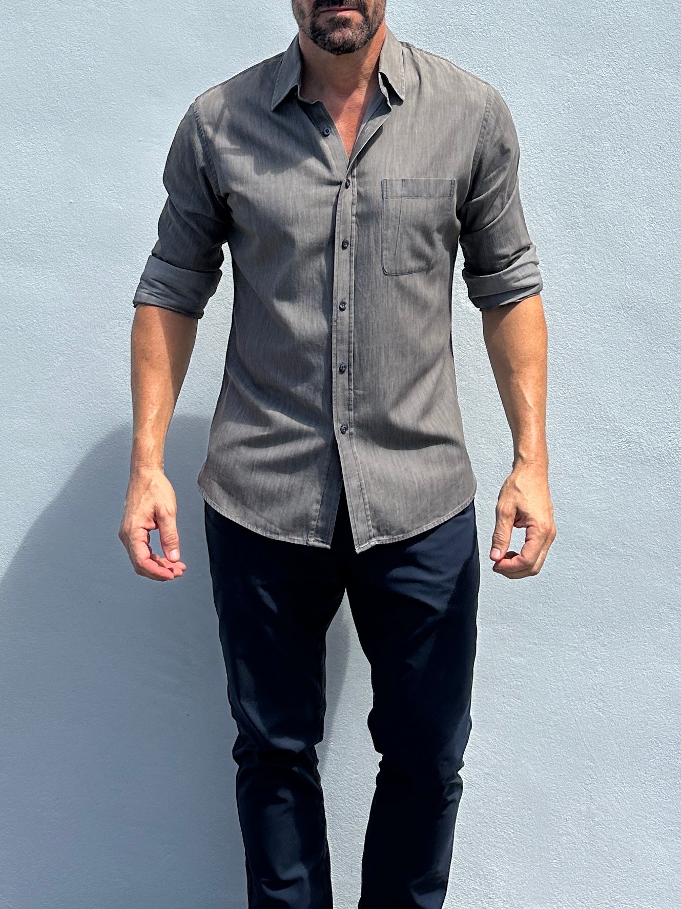 Our simple, clean, one-pocket denim shirt is made from 100% cotton. It's about half the weight of your favorite jeans, has a smoother texture and is extremely soft. The pocket is equipped with our patent-pending Shade-Lock™ to keep your sun or eye glasses from falling when they arent on your face.