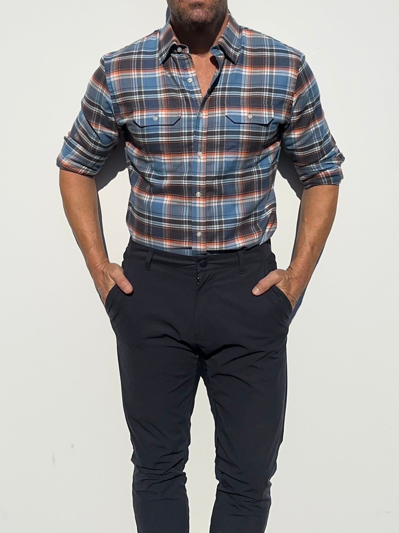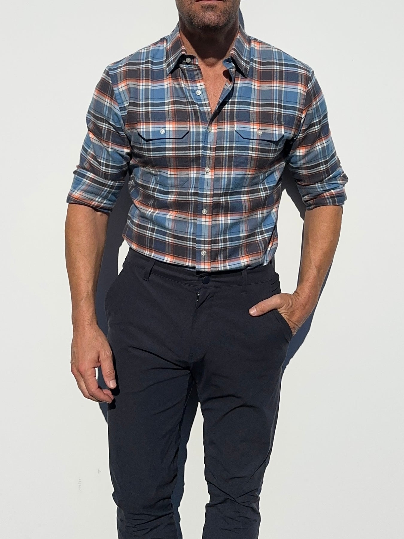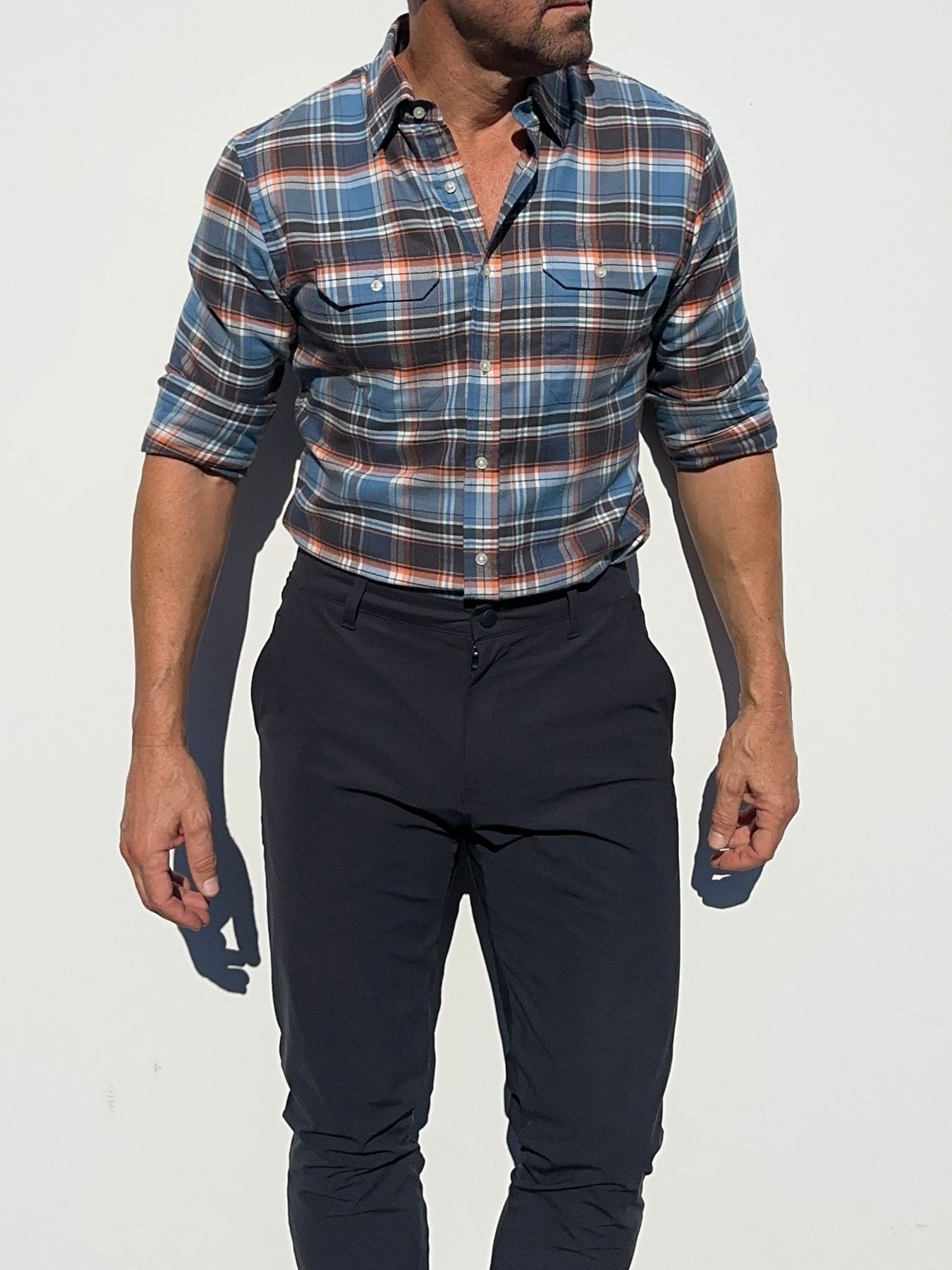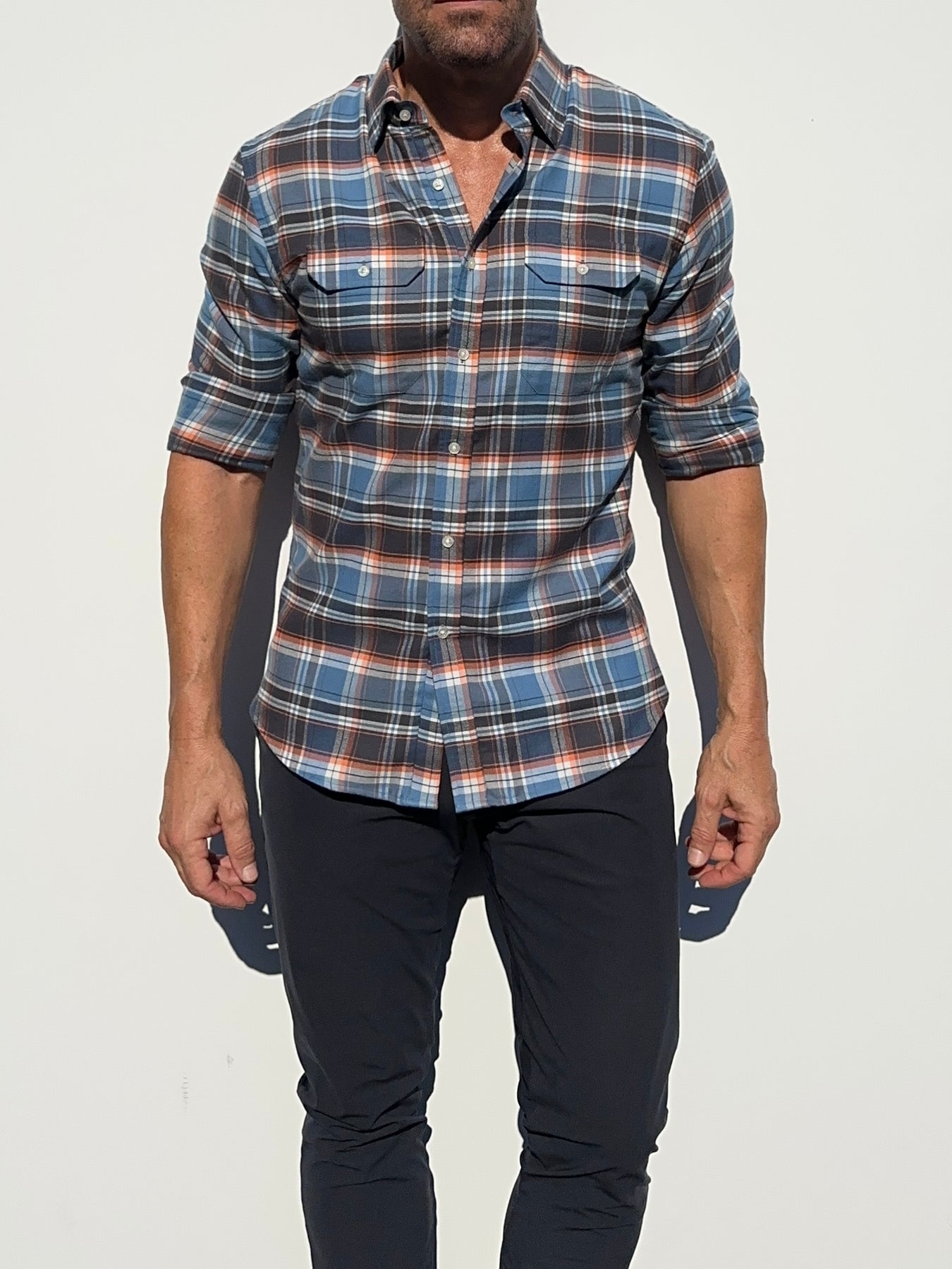Our shirts taper toward the midsection and fit close to the body.