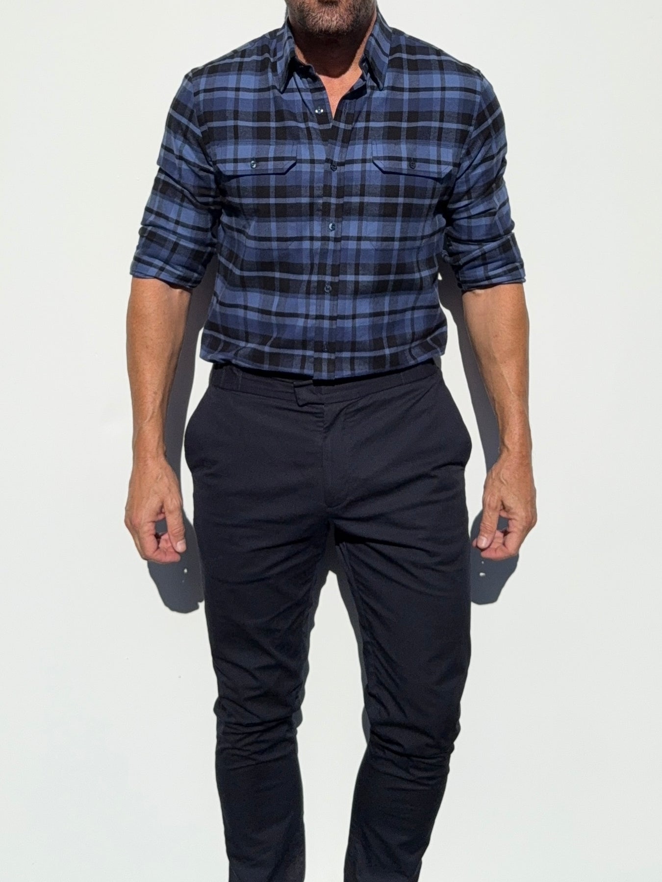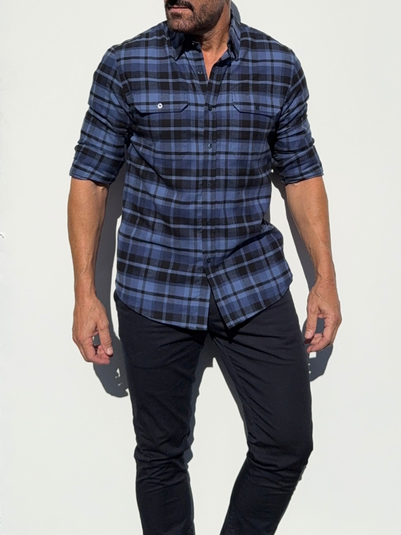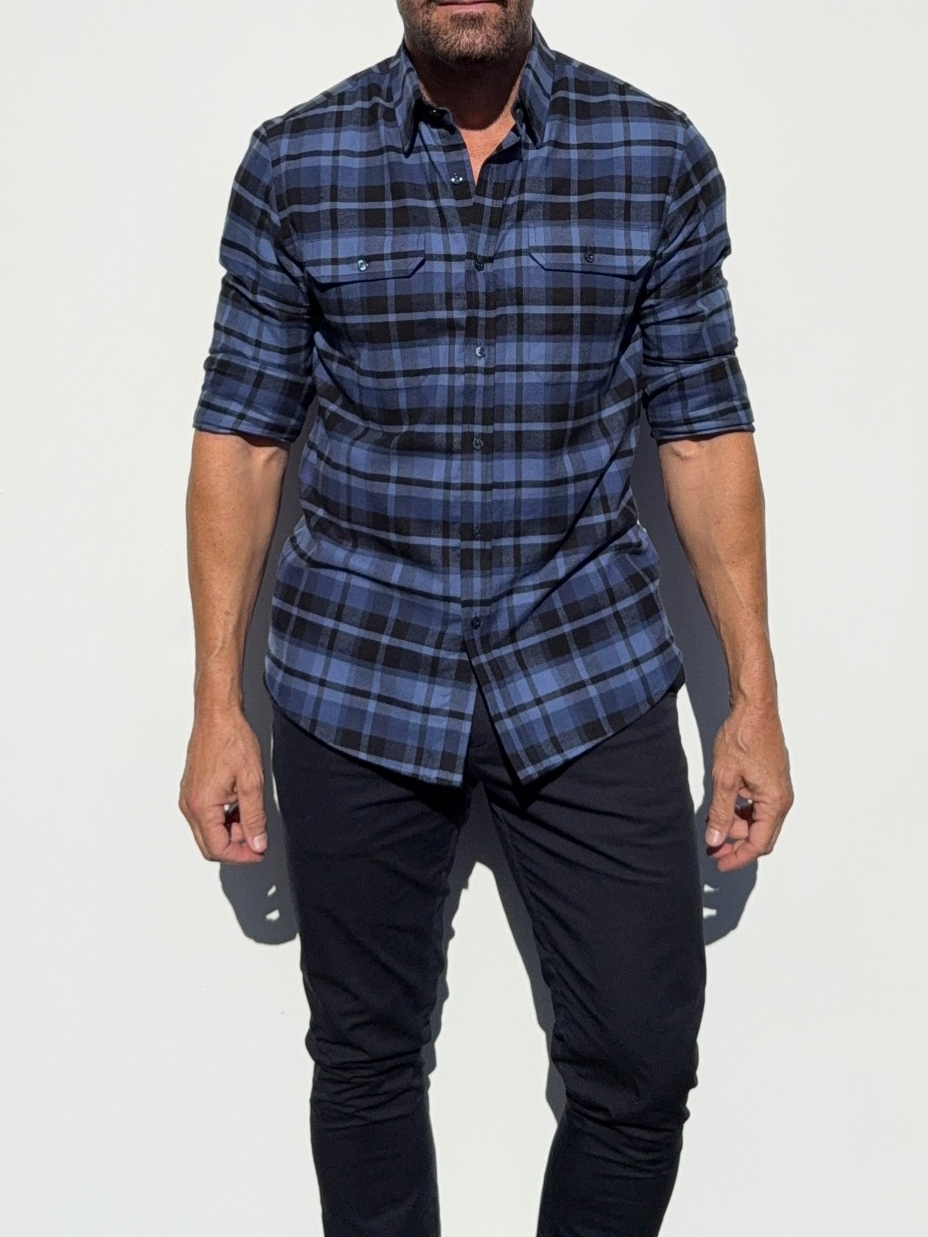 Our shirts taper toward the midsection and fit close to the body.