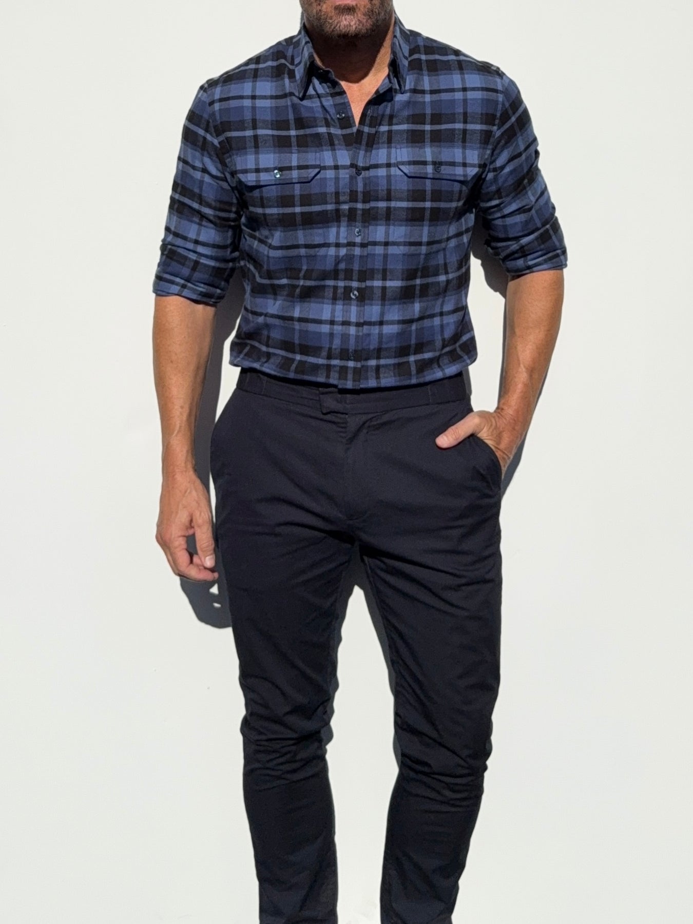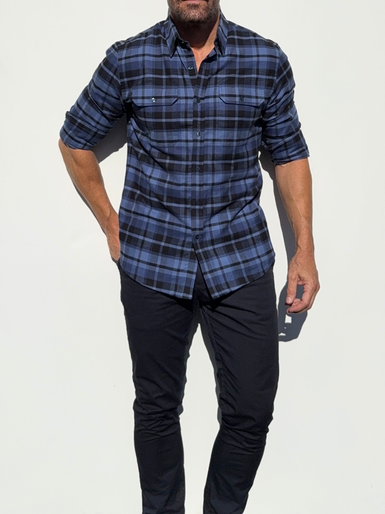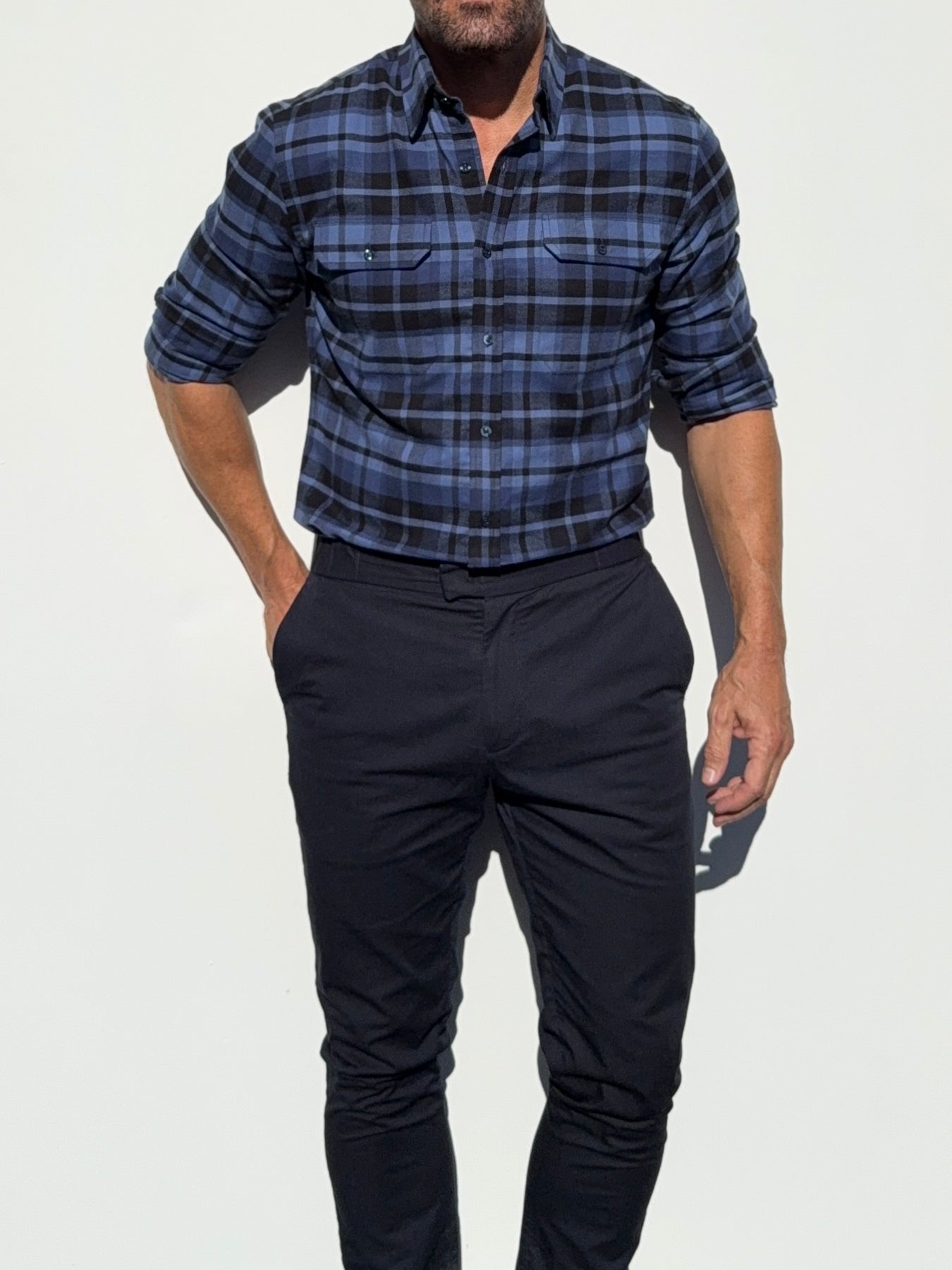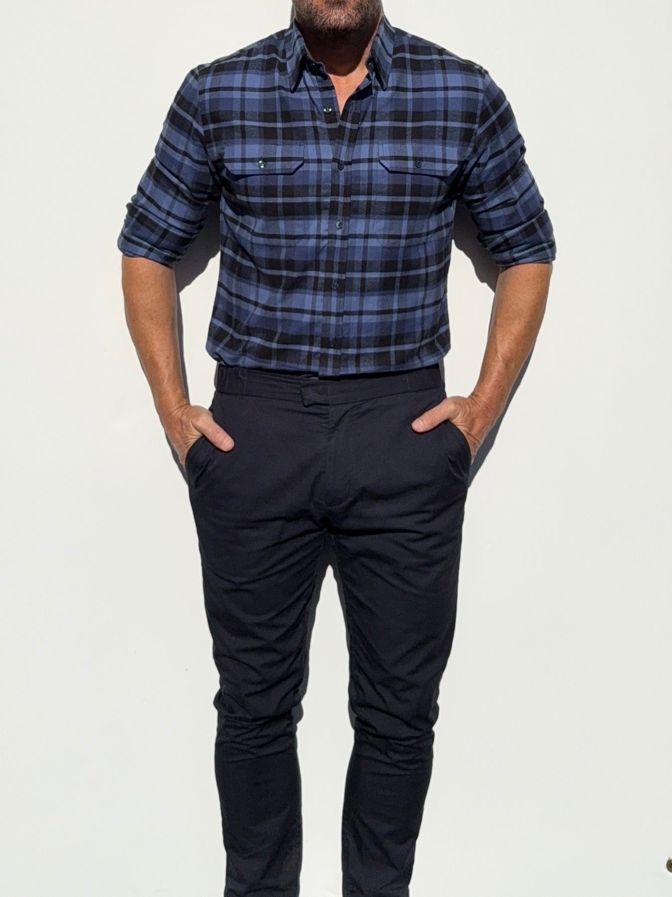 Our shirts taper toward the midsection and fit close to the body.