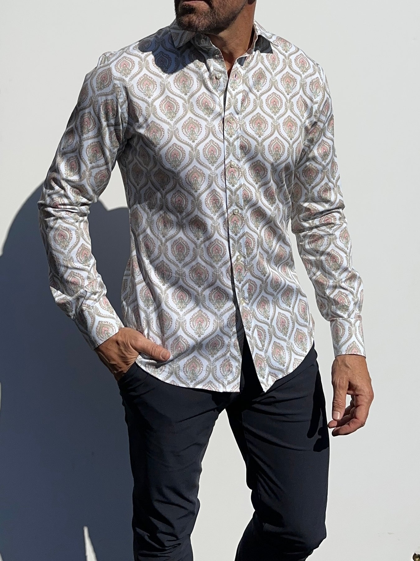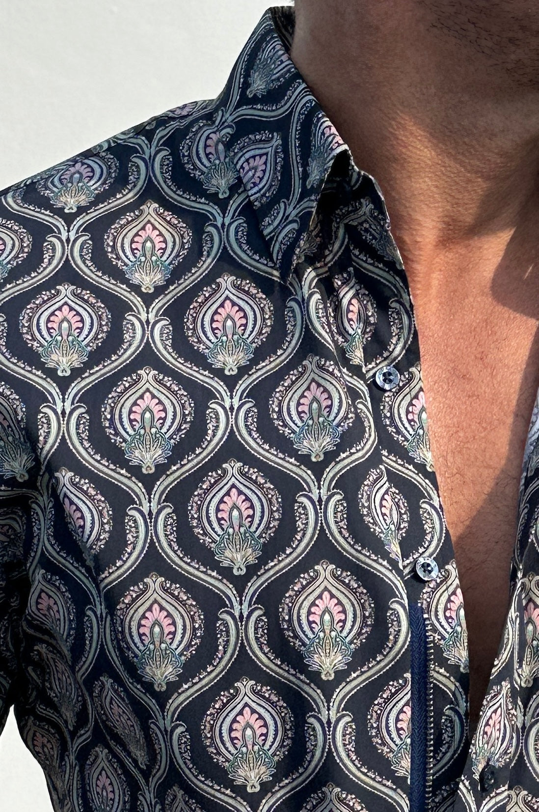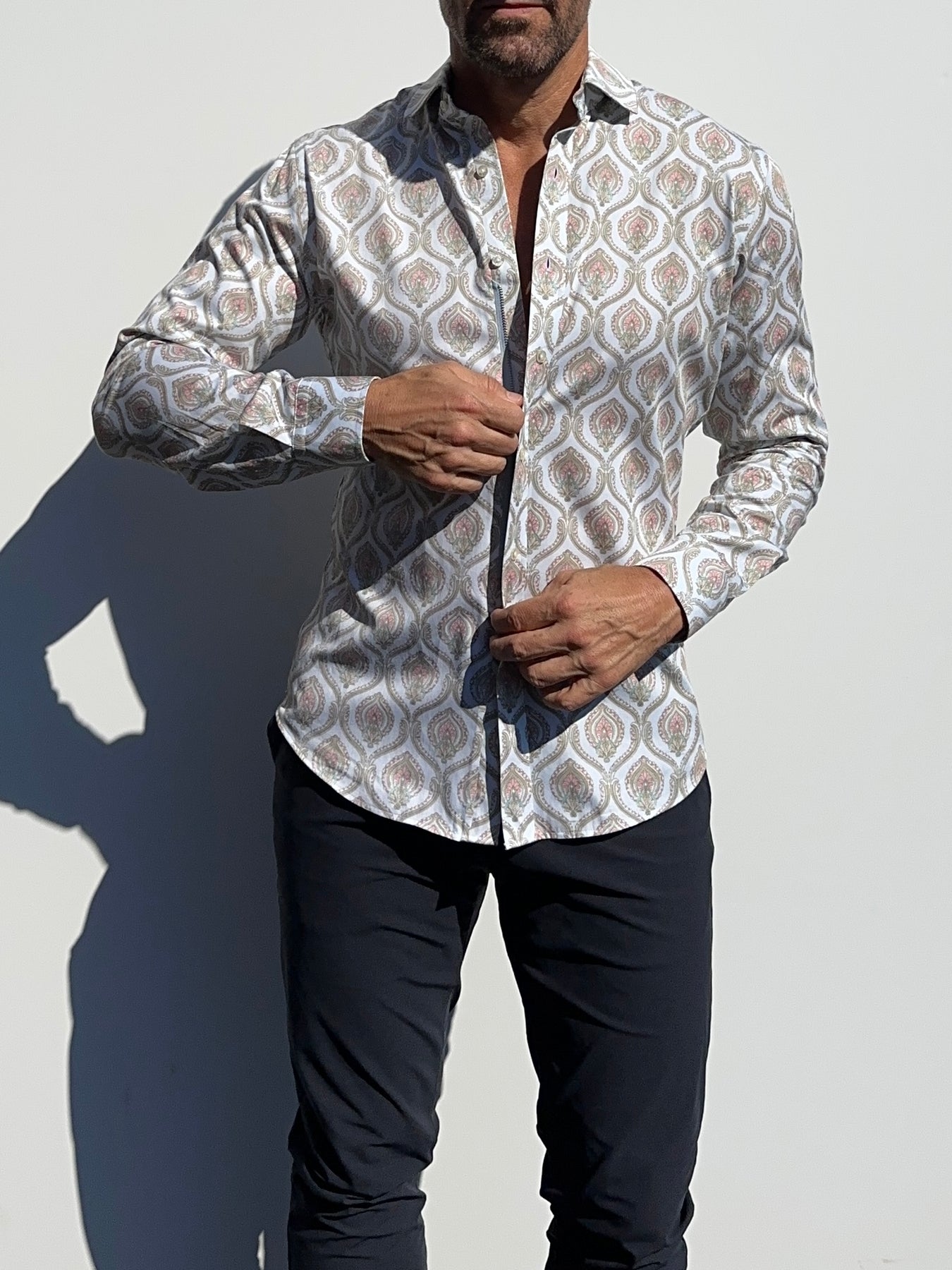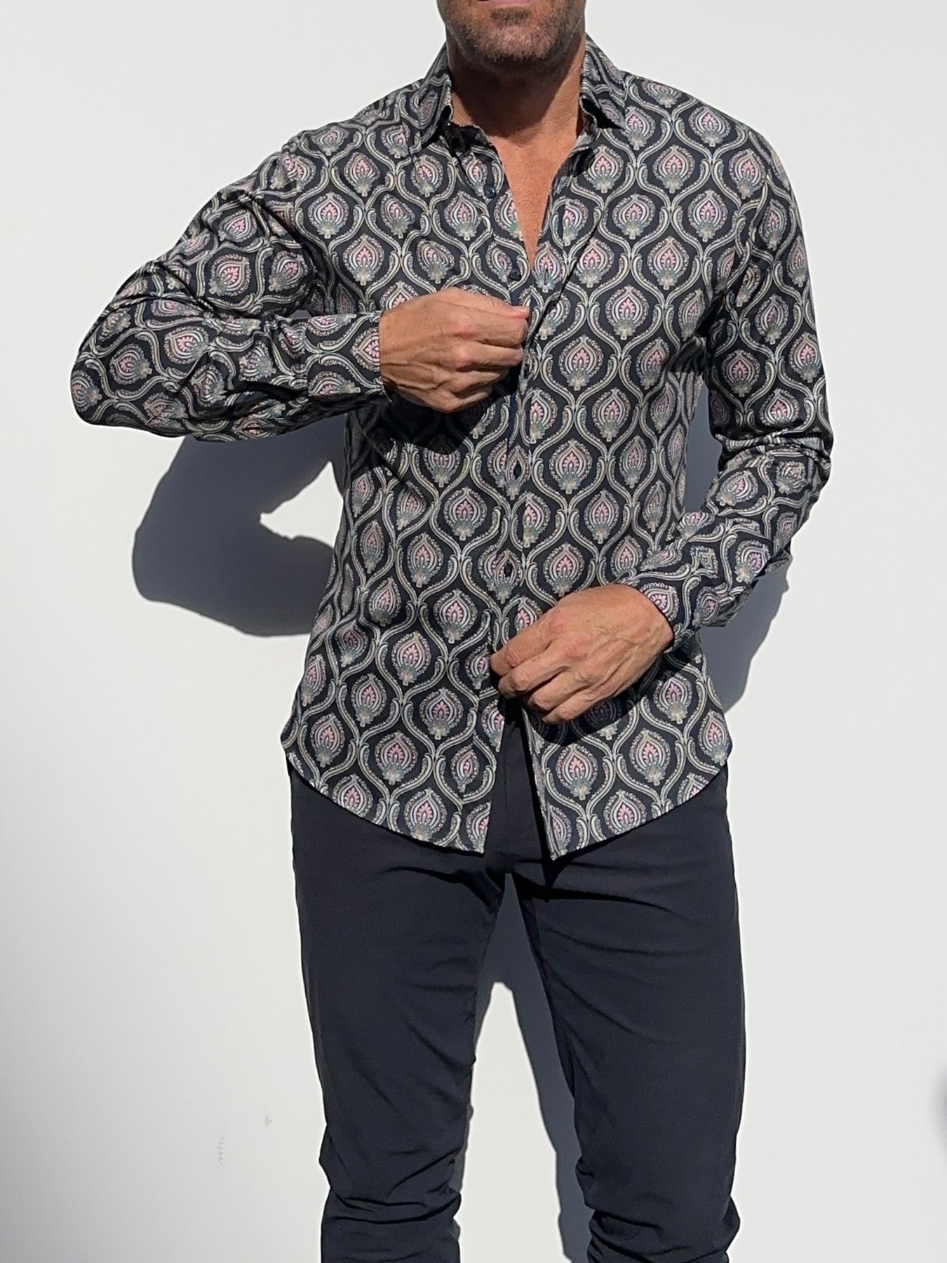 The shirts in our Small Batch Party Series are custom prints made exclusively for Teddy Stratford. These two shirts are made from a robust 100% cotton broadcloth with a sateen finish and a very subtle sheen. They have a semi-spread collar to give them a slightly dressy edge in case the party gets serious.