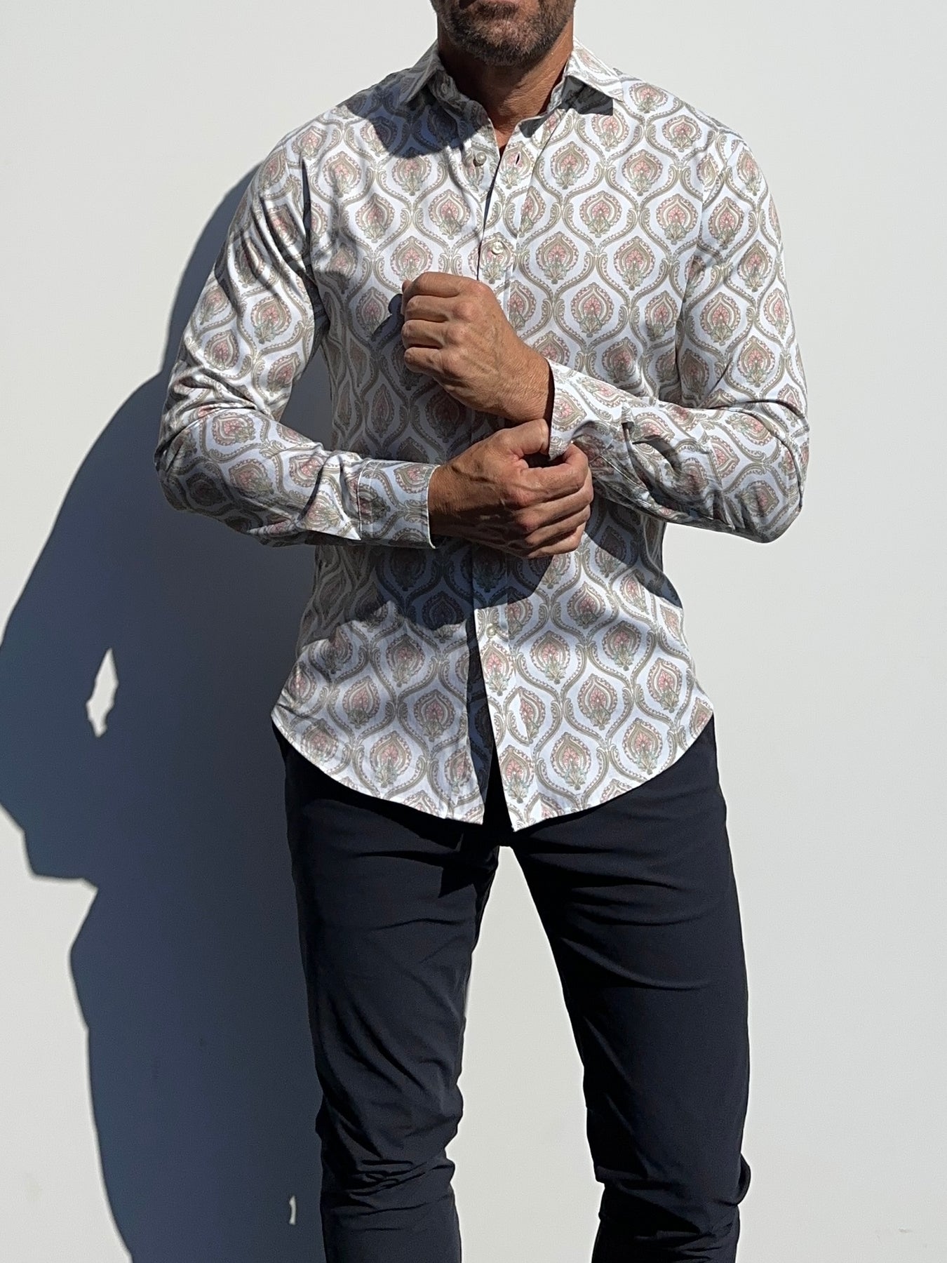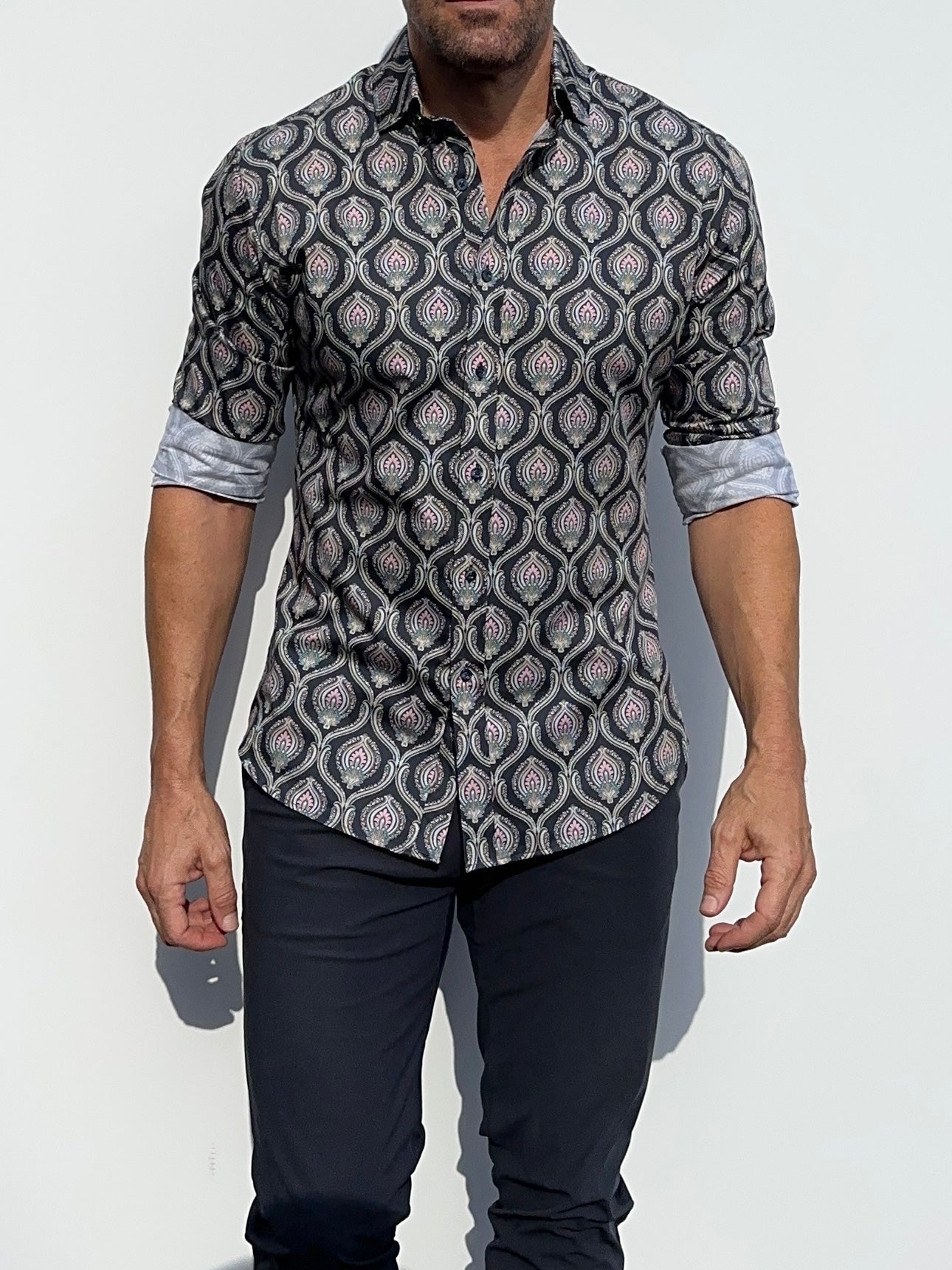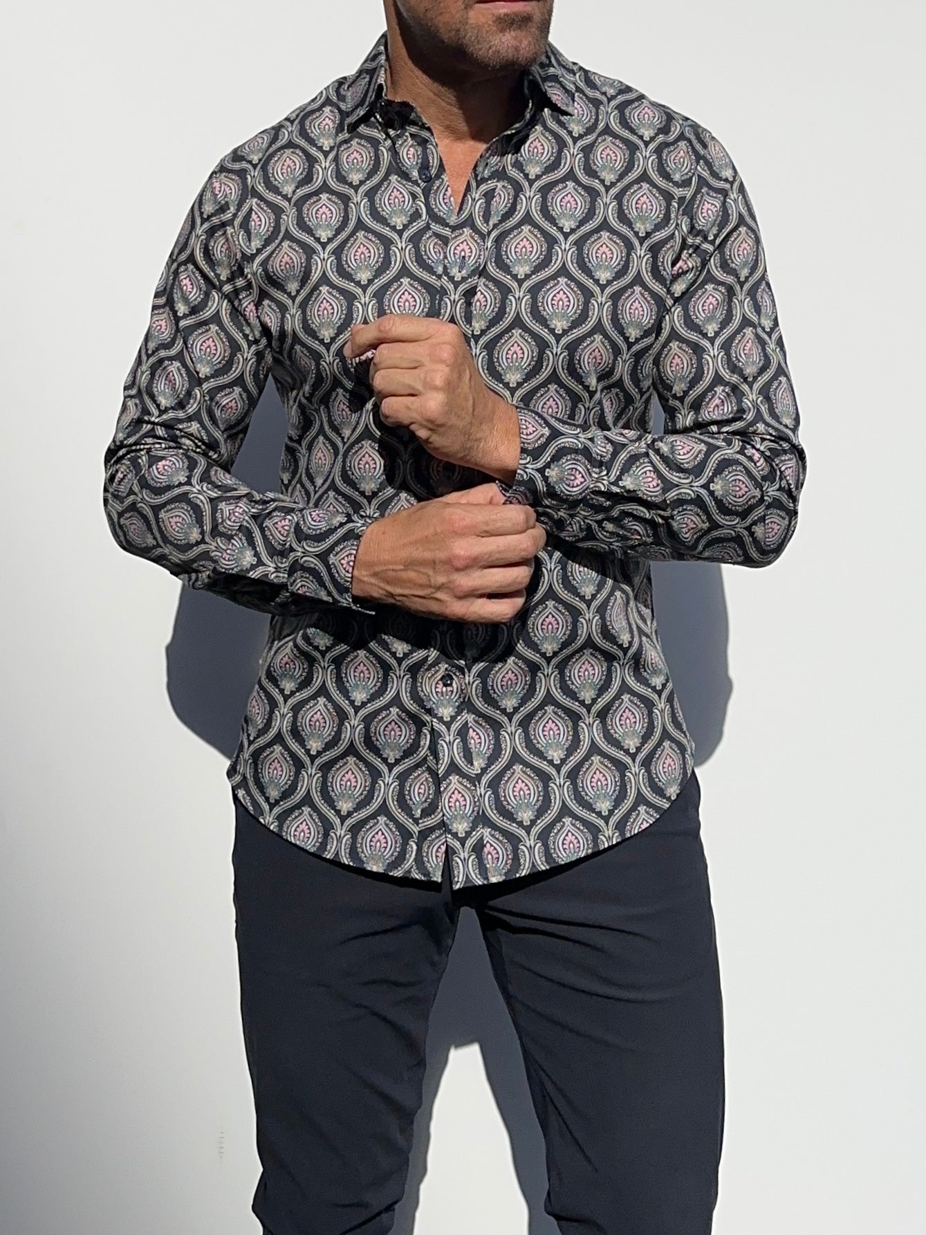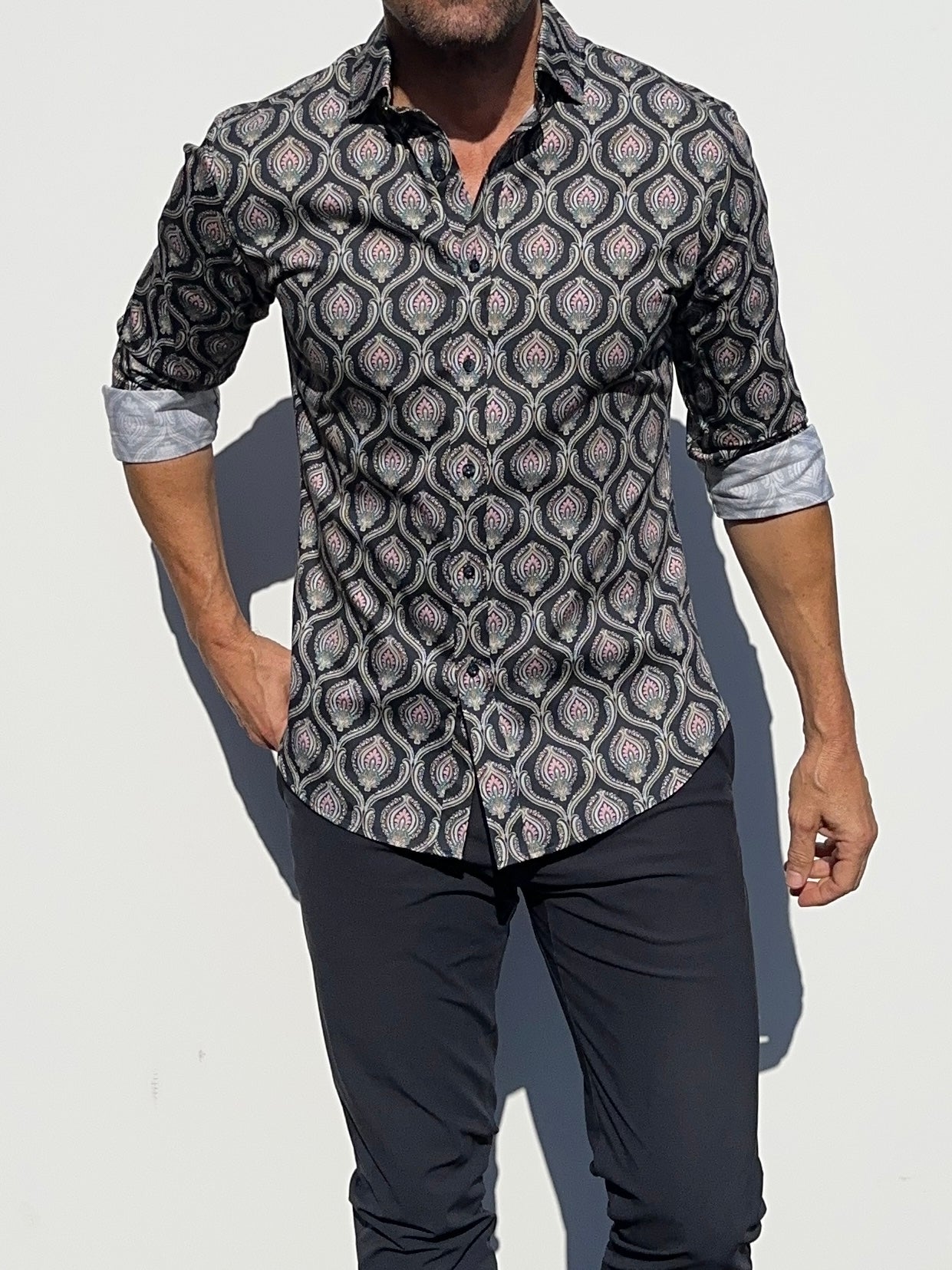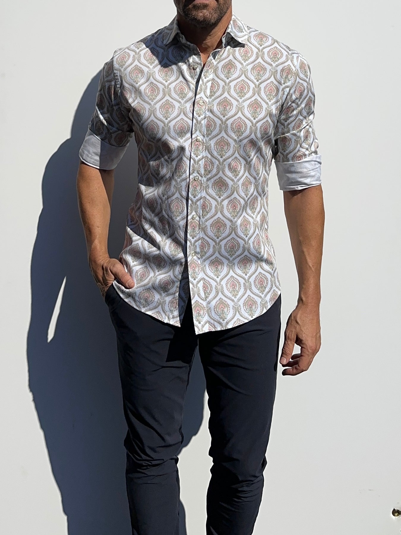 The shirts in our Small Batch Party Series are custom prints made exclusively for Teddy Stratford. These two shirts are made from a robust 100% cotton broadcloth with a sateen finish and a very subtle sheen. They have a semi-spread collar to give them a slightly dressy edge in case the party gets serious.