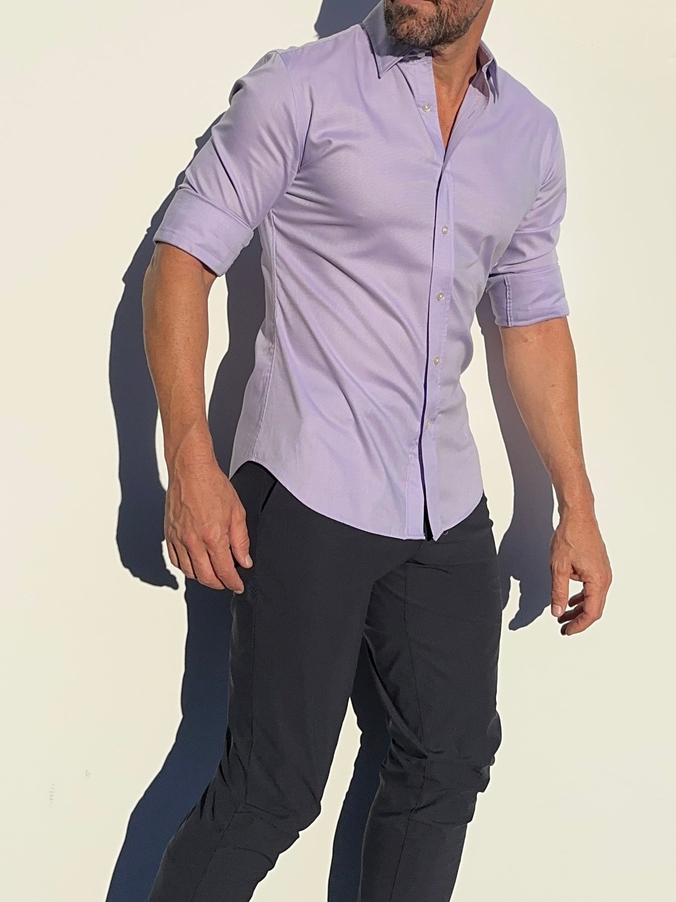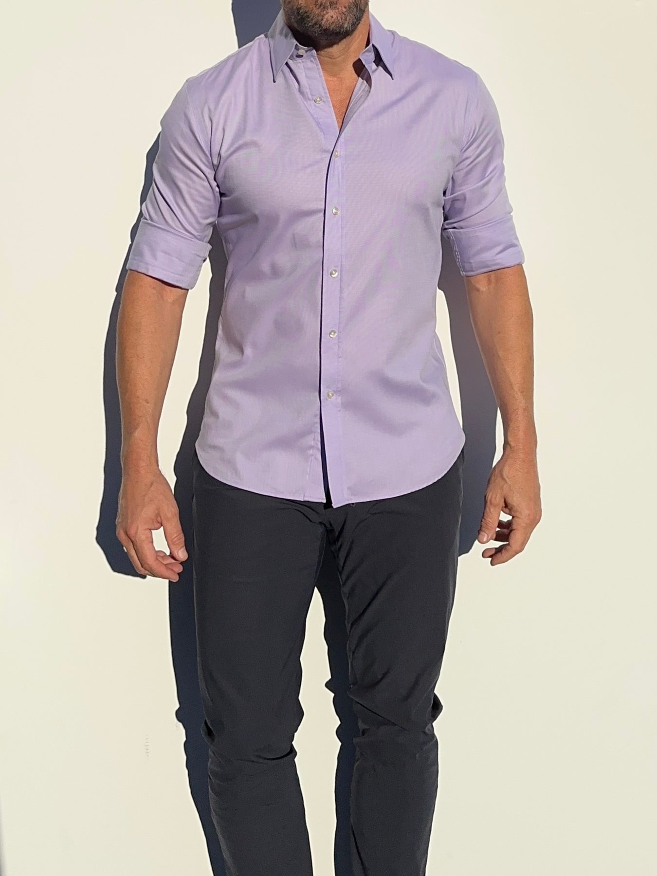 Our shirts taper toward the midsection and fit close to the body.