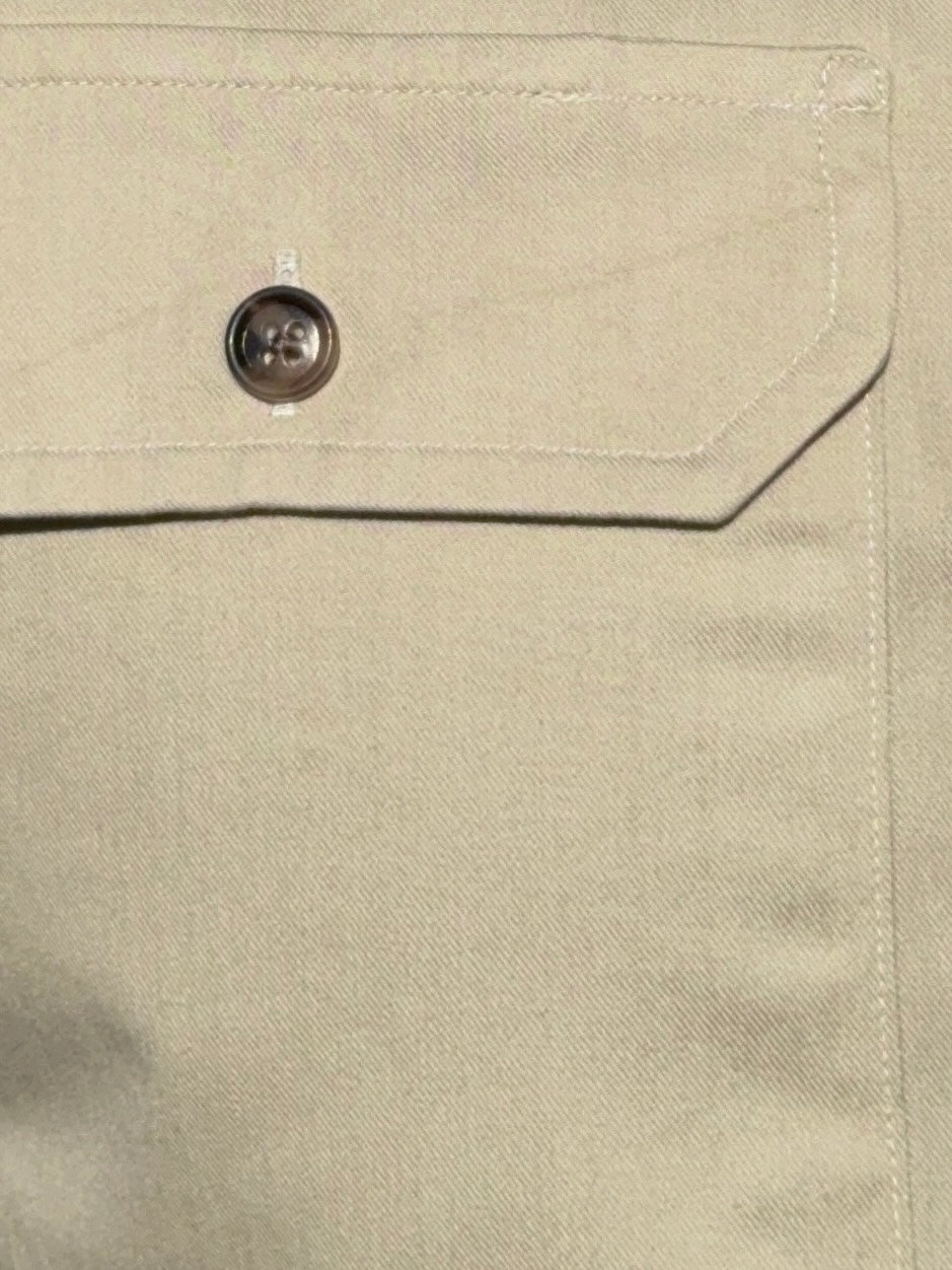 We used a 100% long staple cotton brushed twill that's durable but not heavy or stiff. It has a work shirt look with oversized pockets & a structure that holds its shape whether pressed or wrinkled.