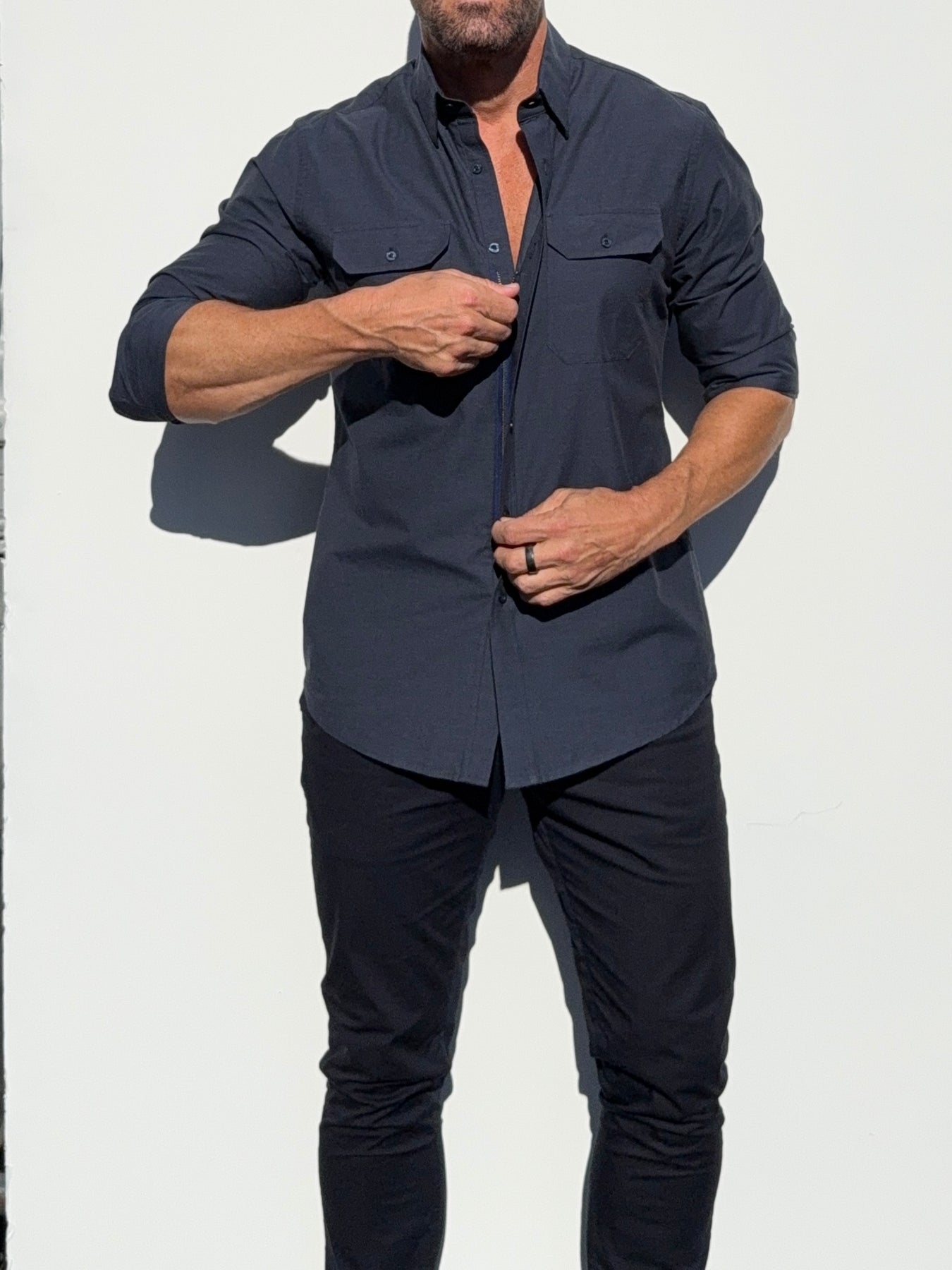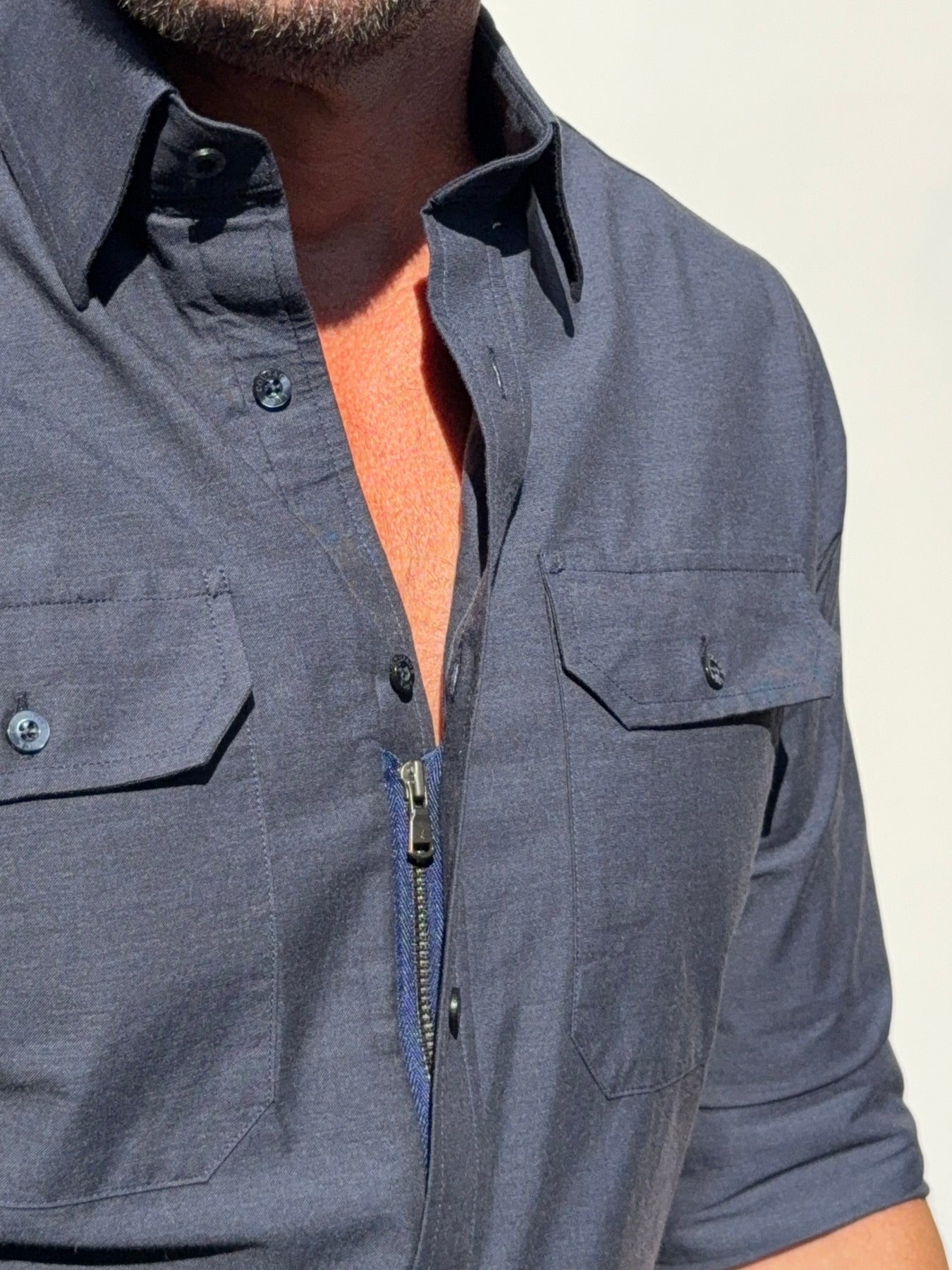 We studied the archetypal male form to find the ideal ratio between shoulders, chest, waist and hips and built our shirt around it. The zipper evenly distributes any tension and allows you to wear a closer fitting shirt, without looking like you're busting out of it.